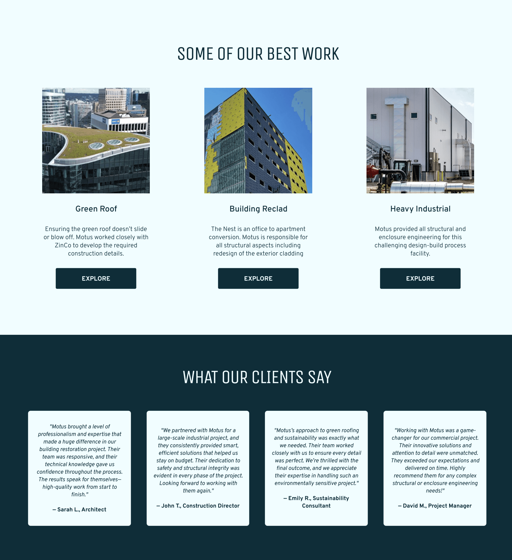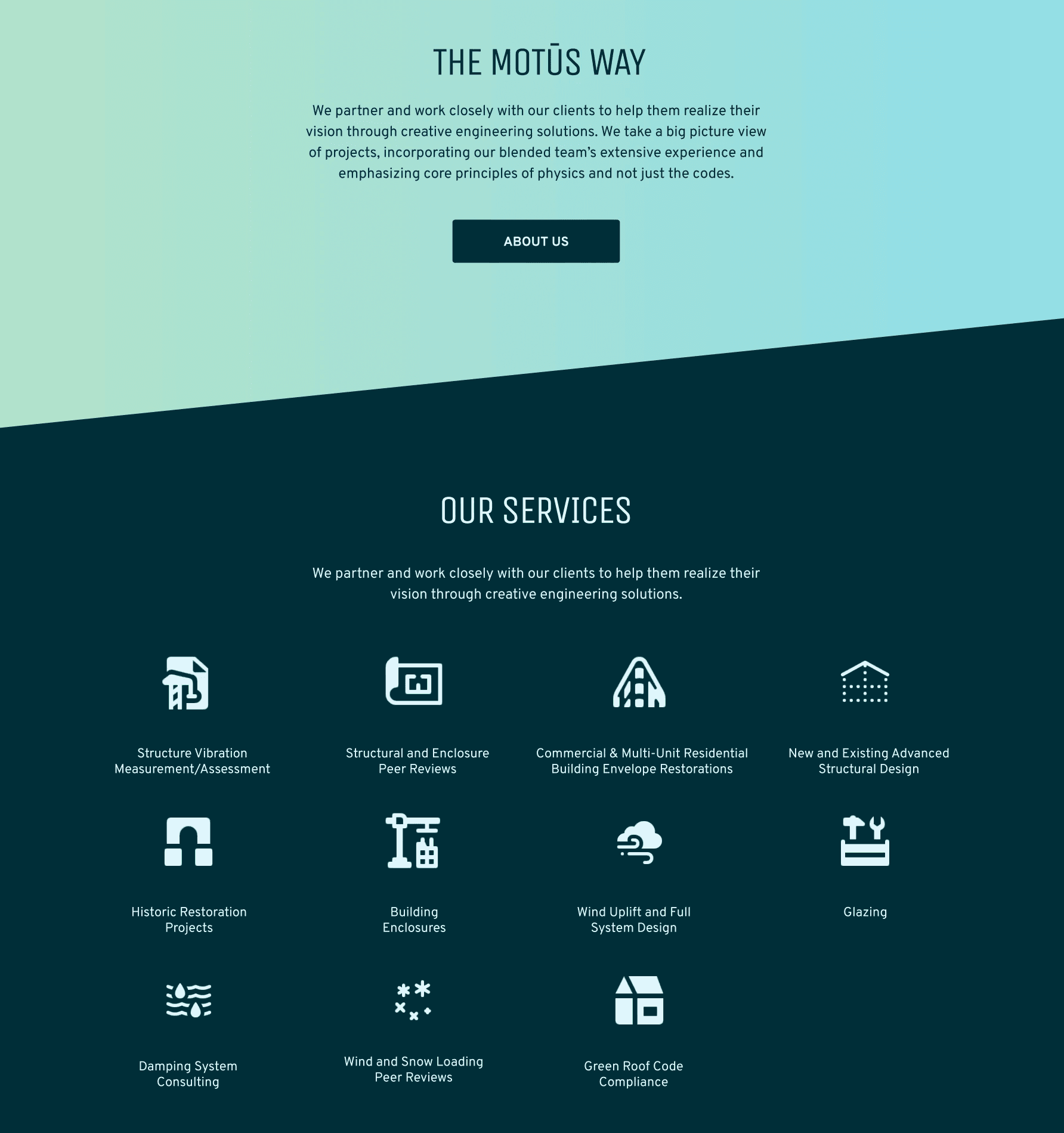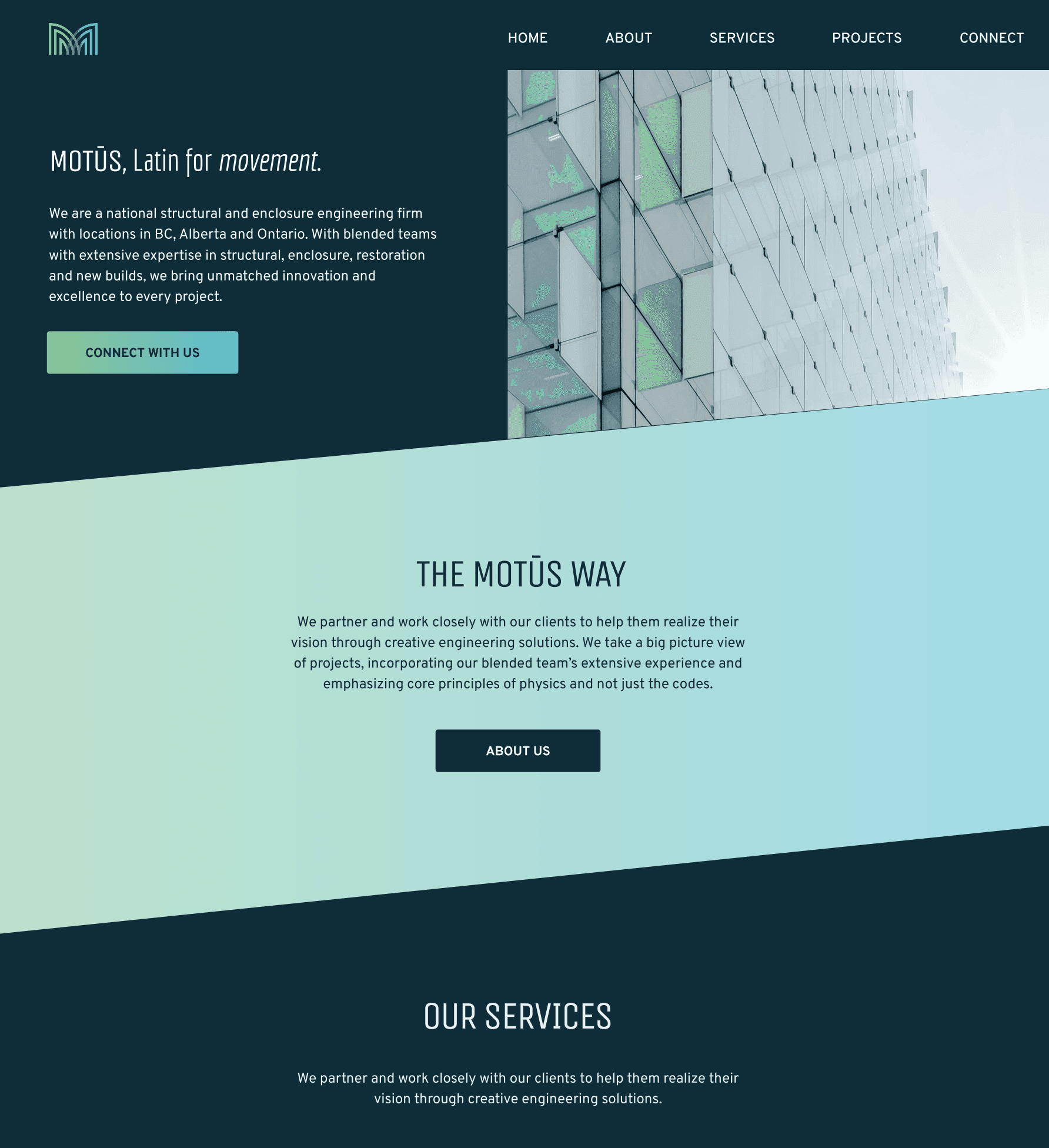 The existing site was sparse and didn’t communicate their dual expertise or creative approach. My strategic goal was to build a site that felt credible, modern, and distinctively “Motus.”