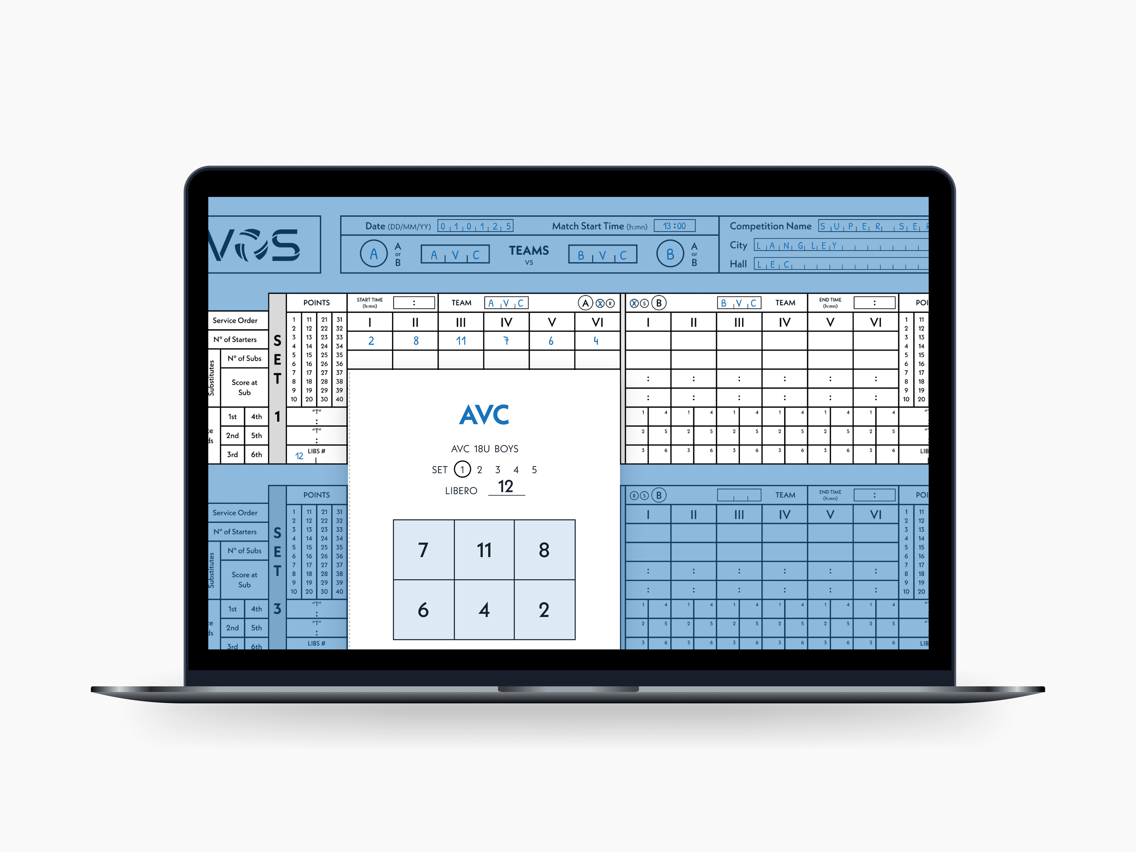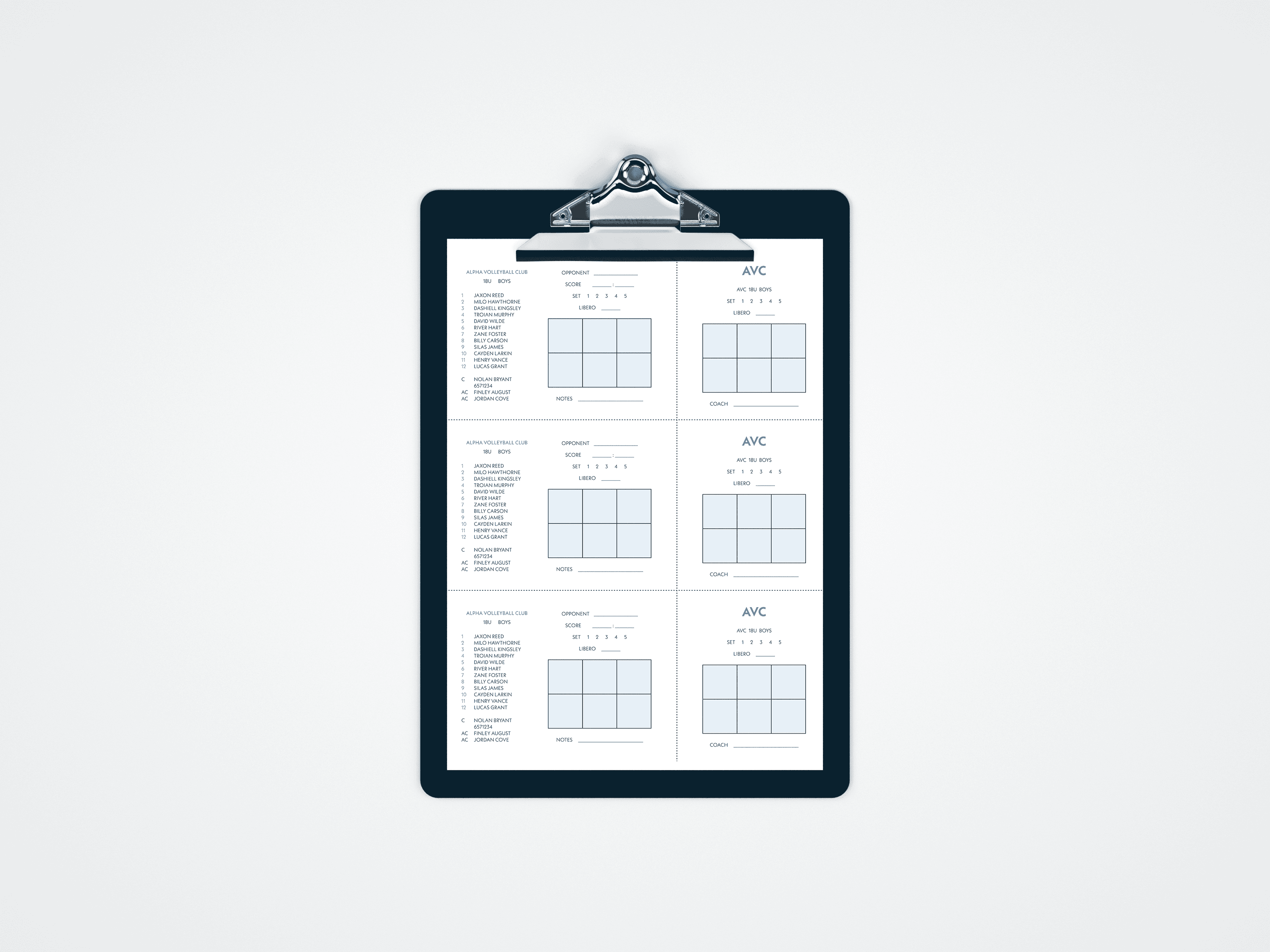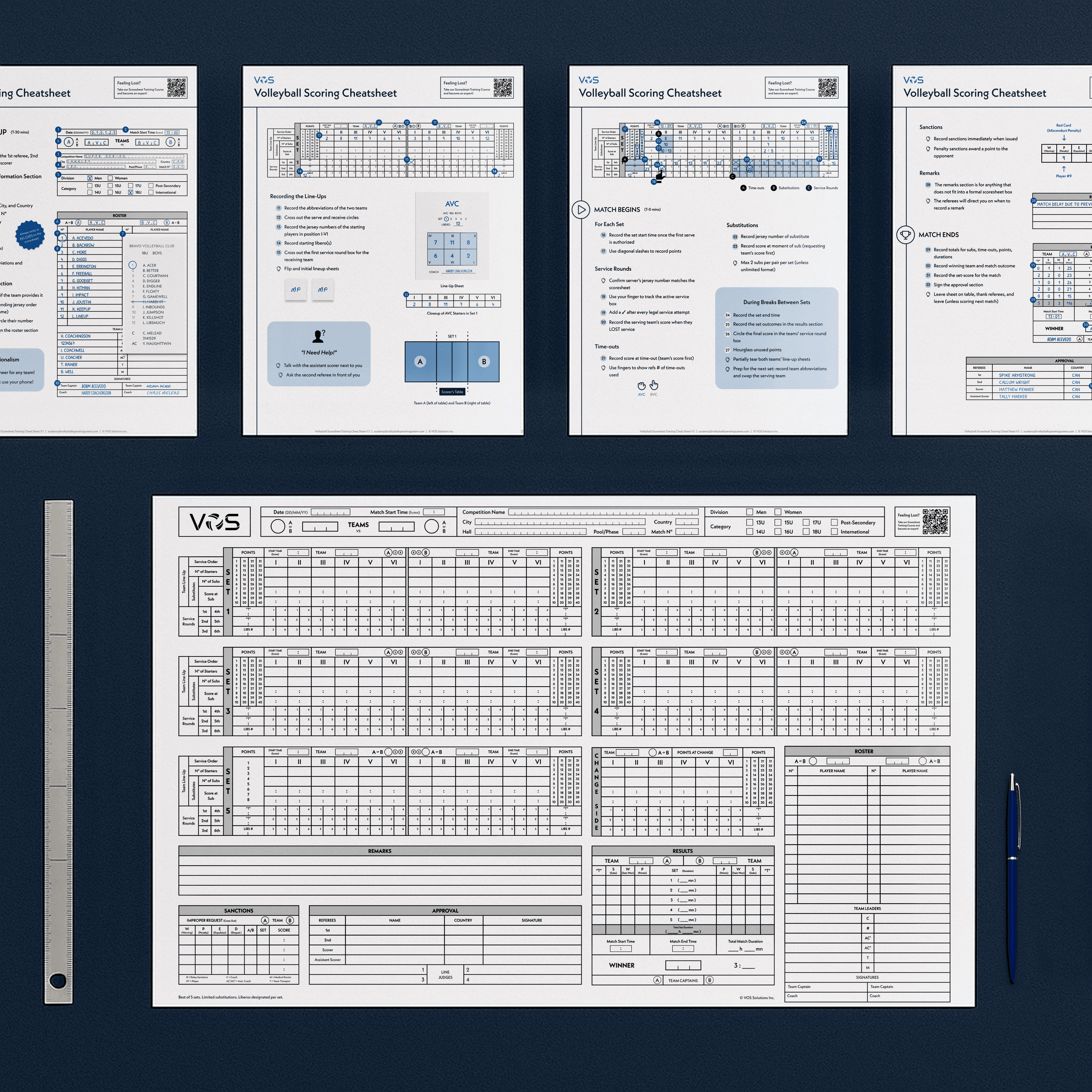 Below are applied brand assets—including lineup sheets, scoresheets, roster stickers, and course video graphics—created for VOS Academy. These were designed during my continued work with VOS Solutions Inc. as their in-house designer following the brand identity engagement.